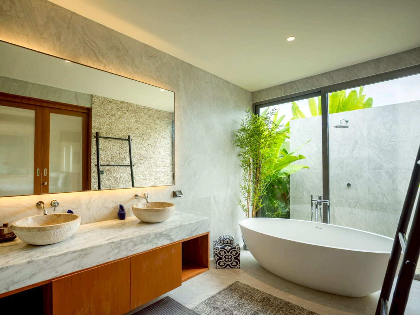 • Master Suite One (Used): Overlooks the pool and gardens with a 7-metre wide footprint. Features a lounge area, walk-in slatted wardrobes, and a vast ensuite with double basins, soaking tub, rain shower, and outdoor shower. Electric blinds provide effortless privacy.