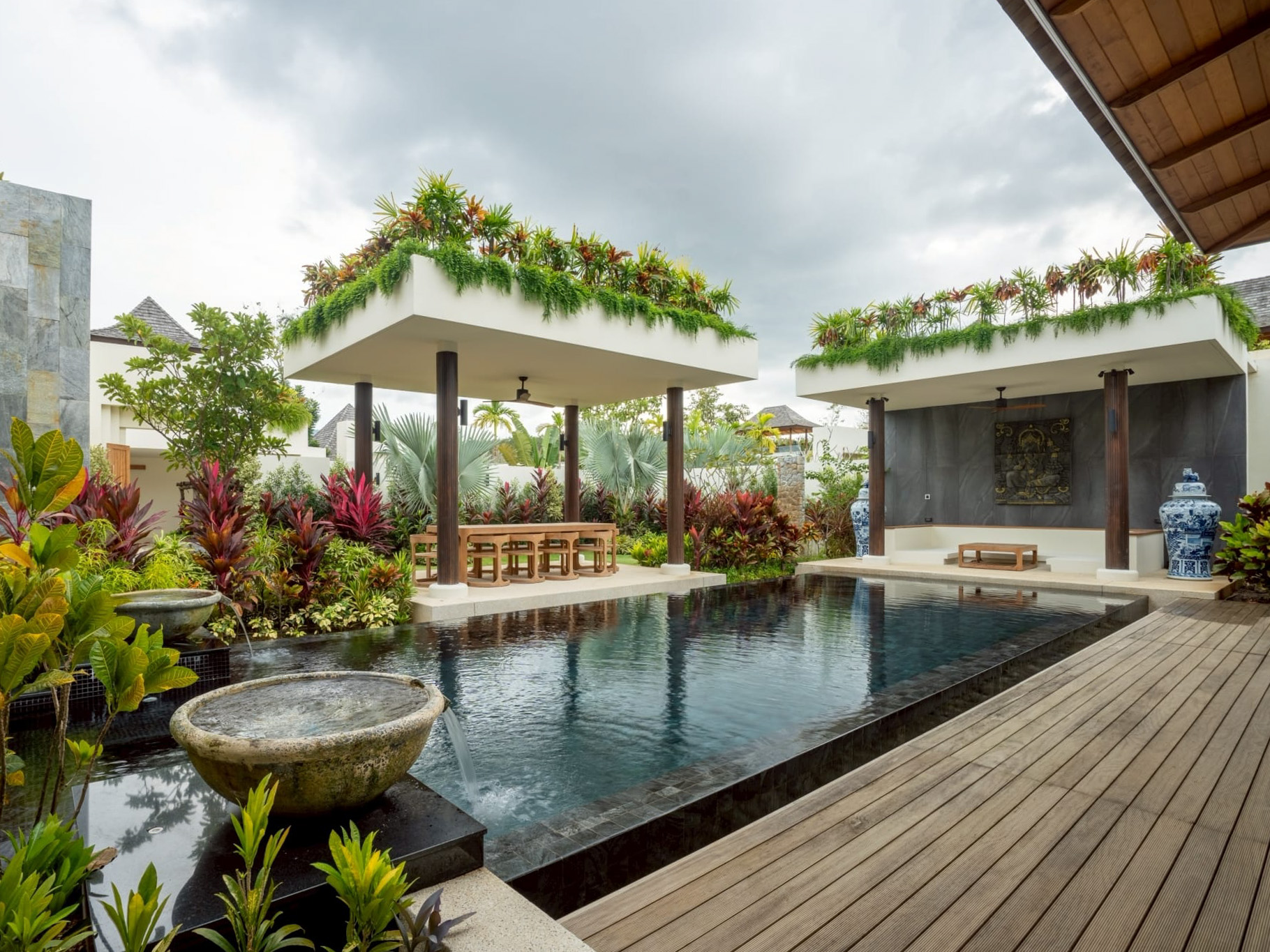 A built-in BBQ and outdoor bar area with stools create an ideal setting for alfresco evenings. The dining area accommodates 8 to 10 guests beneath the stars, framed by lush privacy planting. Behind the poolside sala, a large air-conditioned storage room protects outdoor cushions during rainy season, while a dry pump room and discreet utility areas ensure function meets form.