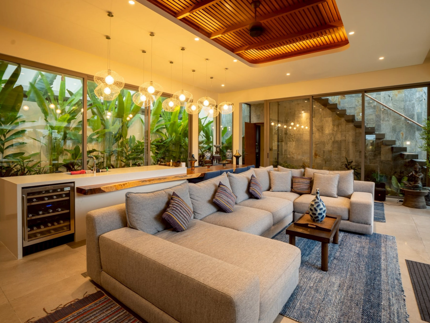 Designed across two levels, the home’s layout balances open, breezy communal areas with private bedroom wings. Glass walls and sliding doors dominate the main living floor, inviting air and light while framing views of the pool and gardens. The main living area, anchored by a large built-in kitchen (never used), flows into an oversized lounge with bespoke furniture and museum-quality Thai and Chinese artefacts. A second upstairs lounge designed in Chinese style captures the sunset perfectly and could double as a private office or game room. Hallways feature curated artwork and outlooks onto lit sculptures and greenery, enhancing the home’s gallery-like presence.