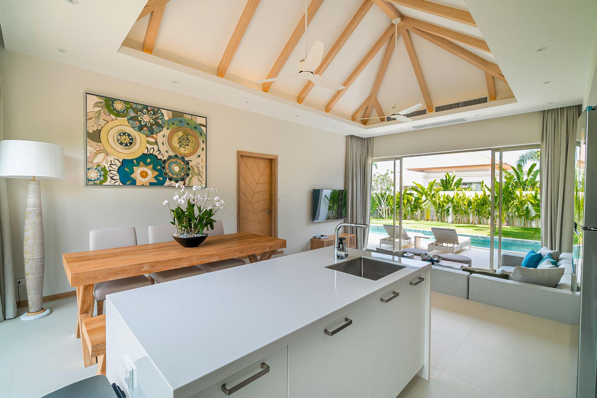 ✅ Single level pool villa features elegant layout & beautiful design; step down from airy dining area to sunken living area, stretched out to outdoor deck, swimming pool and good size tropical garden